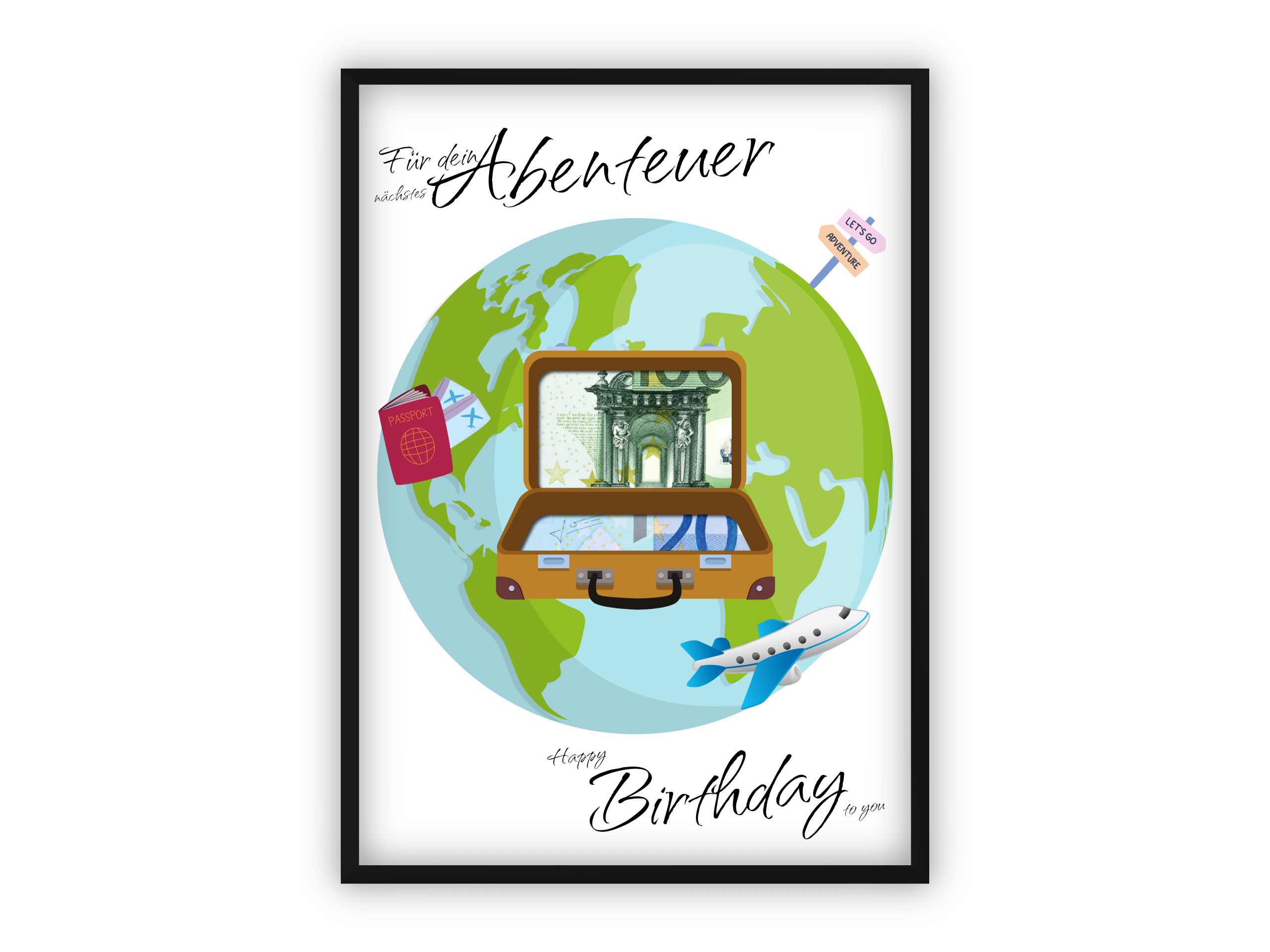 Ein originelles Geldgeschenk für Reiselustige und Abenteurer:innen! Dieses moderne Motiv zeigt einen geöffneten Koffer vor einer bunten Weltkugel – perfekt, um symbolisch einen Reisegutschein oder einen finanziellen Beitrag zum nächsten großen Abenteuer zu überreichen.