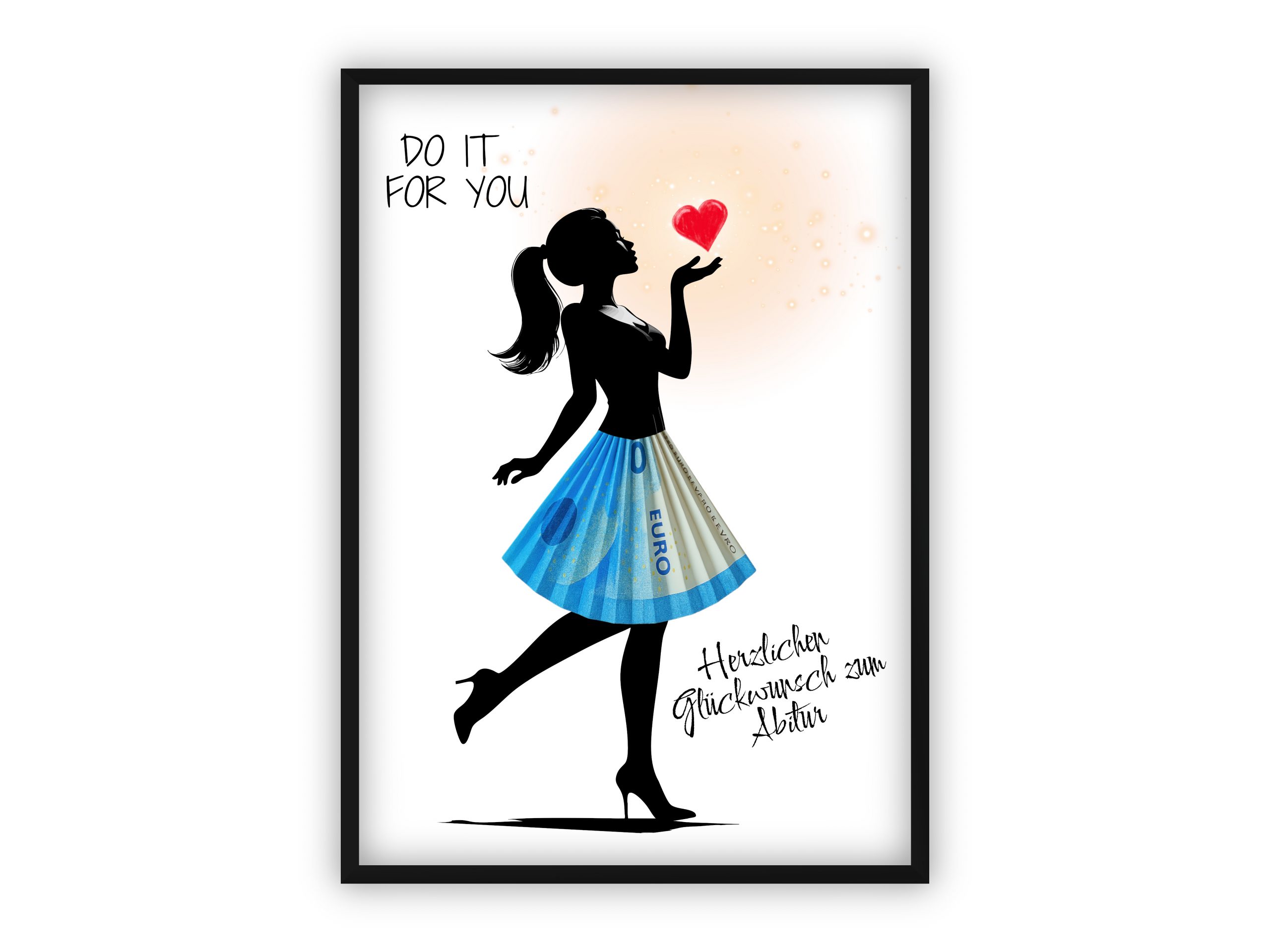 Ein kreatives und modernes Geldgeschenk zum Abitur: Die stilvolle Silhouette einer jungen Frau in Bewegung, die ein Herz emporhält, wird durch einen echten gefalteten Geldschein zum Leben erweckt. Der Rock aus Papiergeld sorgt für einen faszinierenden 3D-Effekt und macht dieses Motiv zu einem persönlichen und außergewöhnlichen Geschenk zum bestandenen Abschluss.