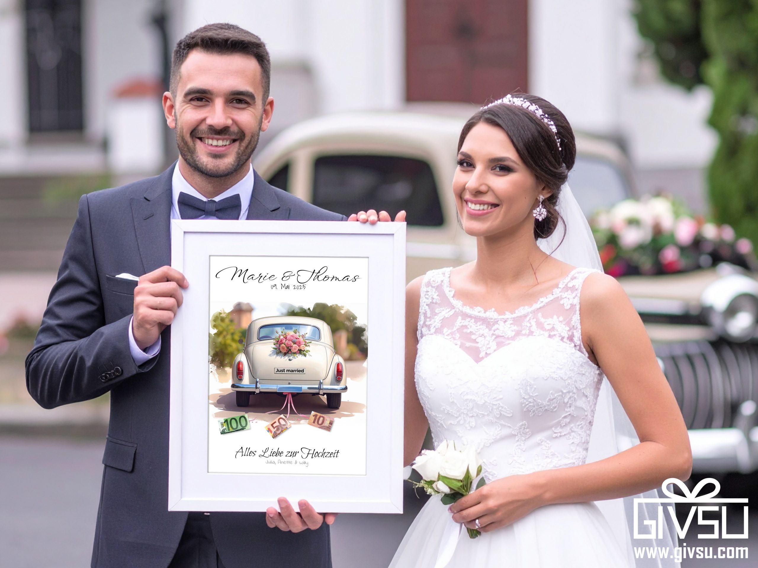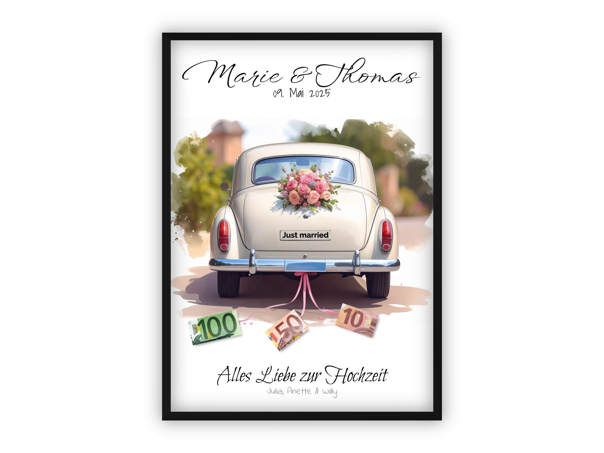 Im Mittelpunkt steht ein stilvoller Oldtimer in elegantem Beige, der symbolisch in den gemeinsamen Lebensweg fährt. Drei kleine Seile am Heck bieten Platz, um bis zu drei Geldscheine wie kleine „Dosen“ zu befestigen – ein charmantes Detail mit persönlicher Note. In einem Bilderrahmen wird dieses Motiv zu einem dekorativen Highlight mit Bedeutung.