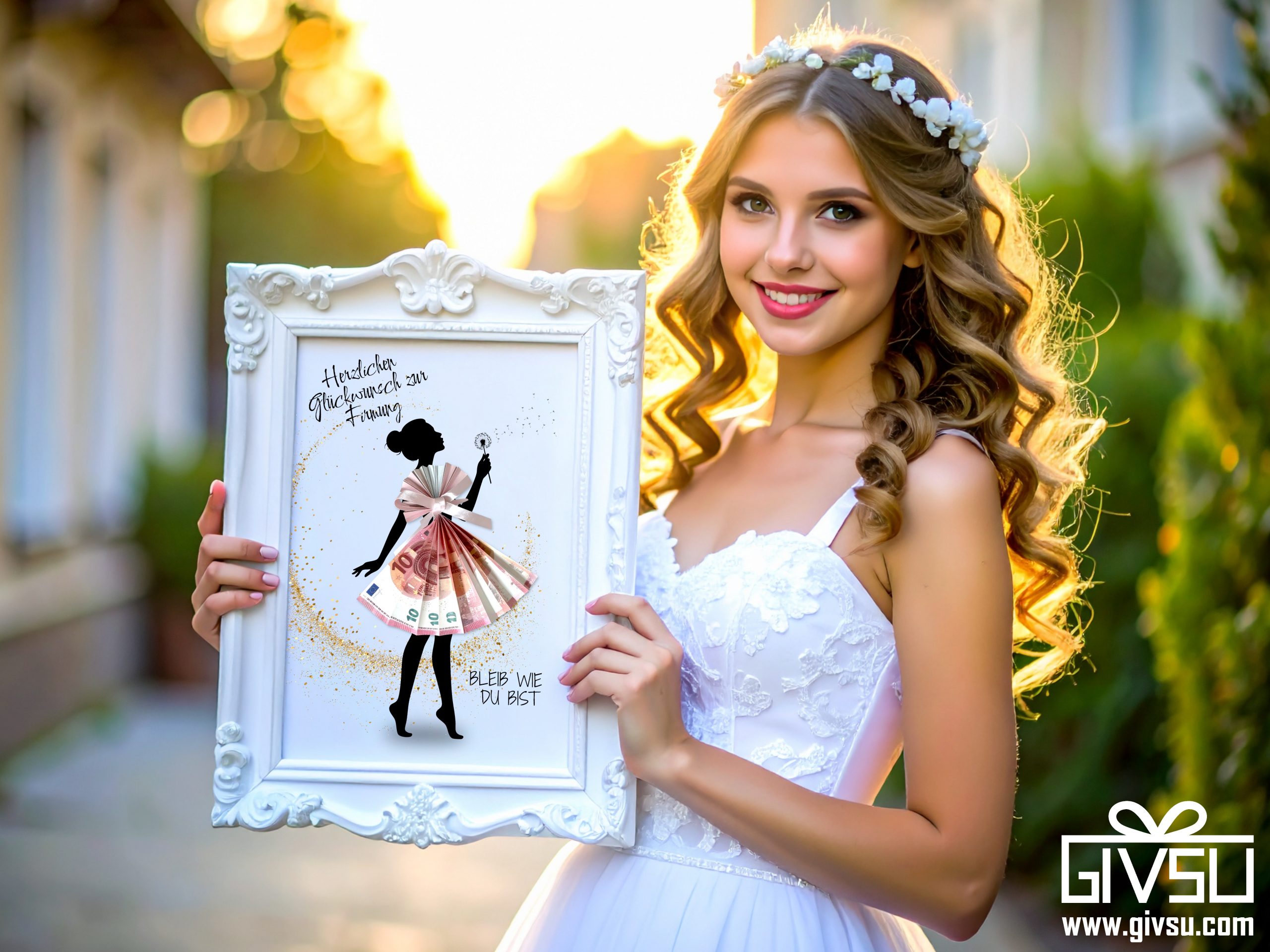 Ein modernes Geschenk zur Firmung mit emotionalem Design: Die stilvolle Silhouette eines Mädchens mit Pusteblume wird durch gefaltete Geldscheine in Kleidform zu einem echten Blickfang. Dieses Motiv kombiniert Kreativität, christliche Symbolik und persönliche Gestaltung auf elegante Weise.