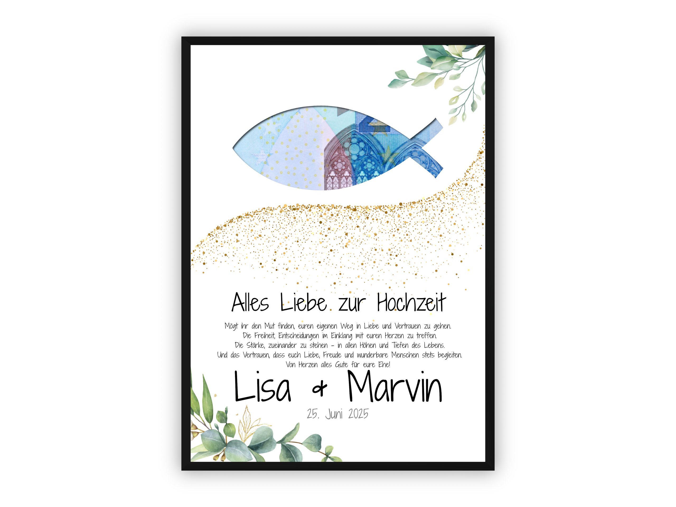 Ein symbolisches und stilvolles Geschenk zur Hochzeit: Das christliche Fischsymbol, designt in edler Geldschein-Optik, steht im Mittelpunkt dieses festlichen Motivs. Umgeben von zarten botanischen Elementen und goldenen Akzenten, kombiniert es christliche Bedeutung mit zeitgemäßem Design. Der perfekte Rahmen für die Namen des Brautpaars und das Hochzeitsdatum.