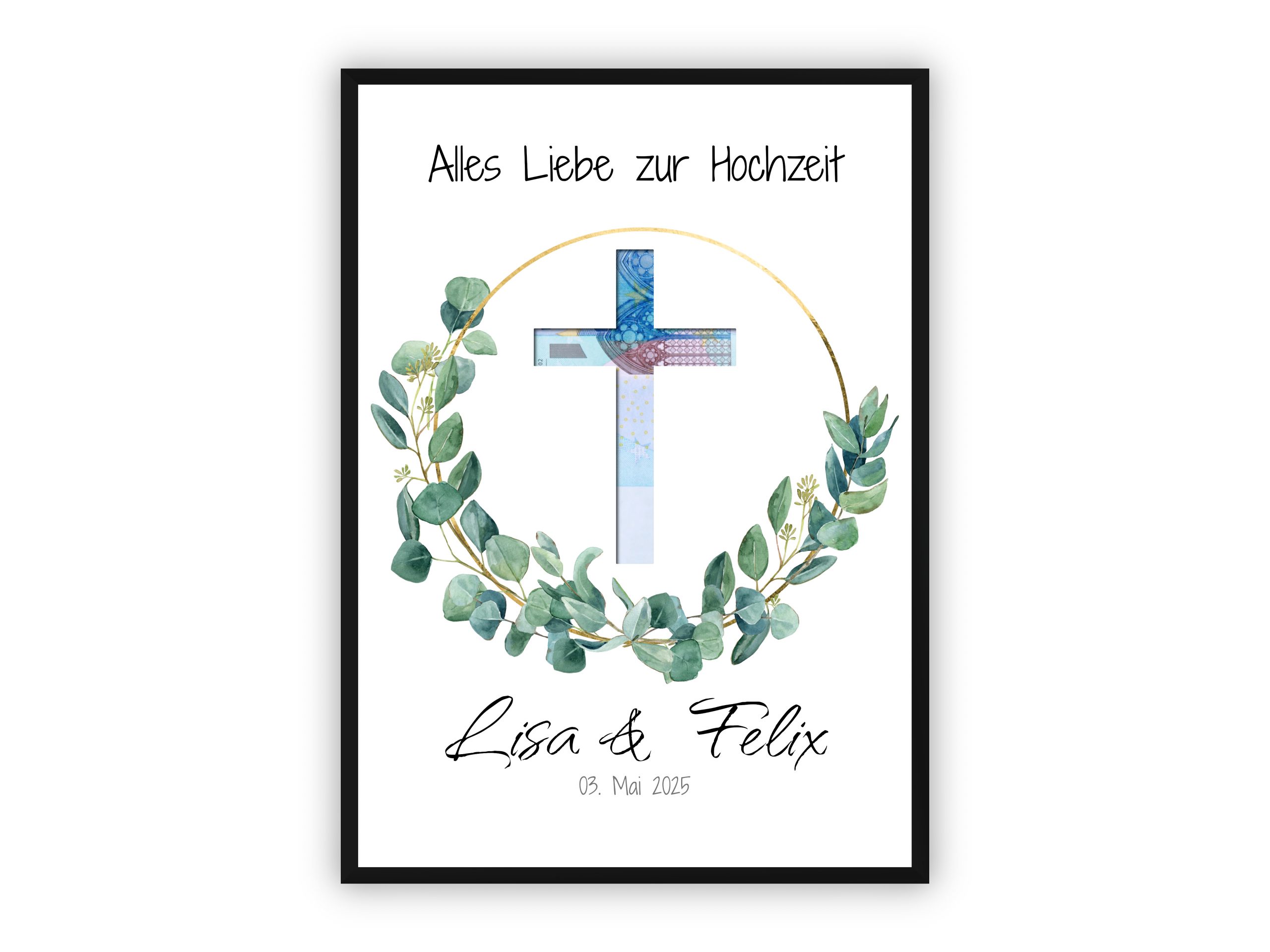 Ein außergewöhnliches Geschenk zur Hochzeit: Dieses elegante Motiv zeigt ein modernes Kreuz im Geldschein-Look, eingefasst in einen liebevoll gestalteten Eukalyptuskranz – veredelt mit den Namen des Brautpaars und dem Hochzeitsdatum. Ein Symbol für Zusammenhalt, Segen und Verbundenheit, das durch seine stilvolle Gestaltung sofort ins Auge fällt.