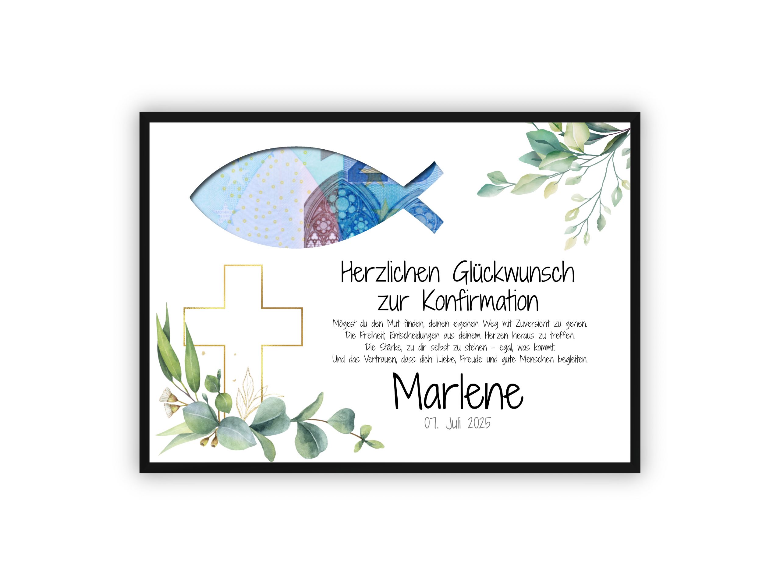 Ein symbolstarkes Geschenk zur Konfirmation mit christlicher Bedeutung und kreativem Twist: Dieses hochwertig gestaltete Motiv zeigt ein Fischsymbol (Ichthys) in Geldschein-Optik, das vom Kunden ausgeschnitten und mit einem echten Geldschein hinterlegt werden kann. Der goldene Kreuzrahmen und die liebevoll arrangierten botanischen Elemente machen das Design zu einer stilvollen Erinnerung an einen bedeutenden Tag.