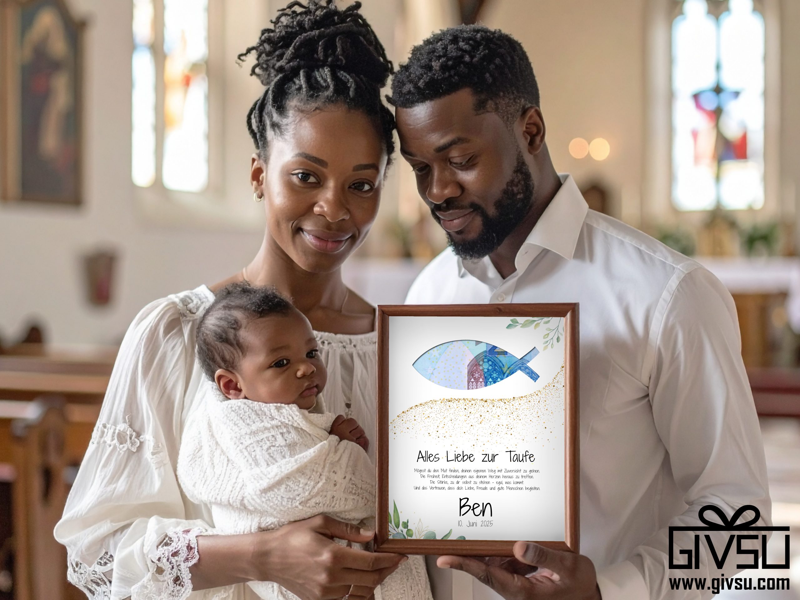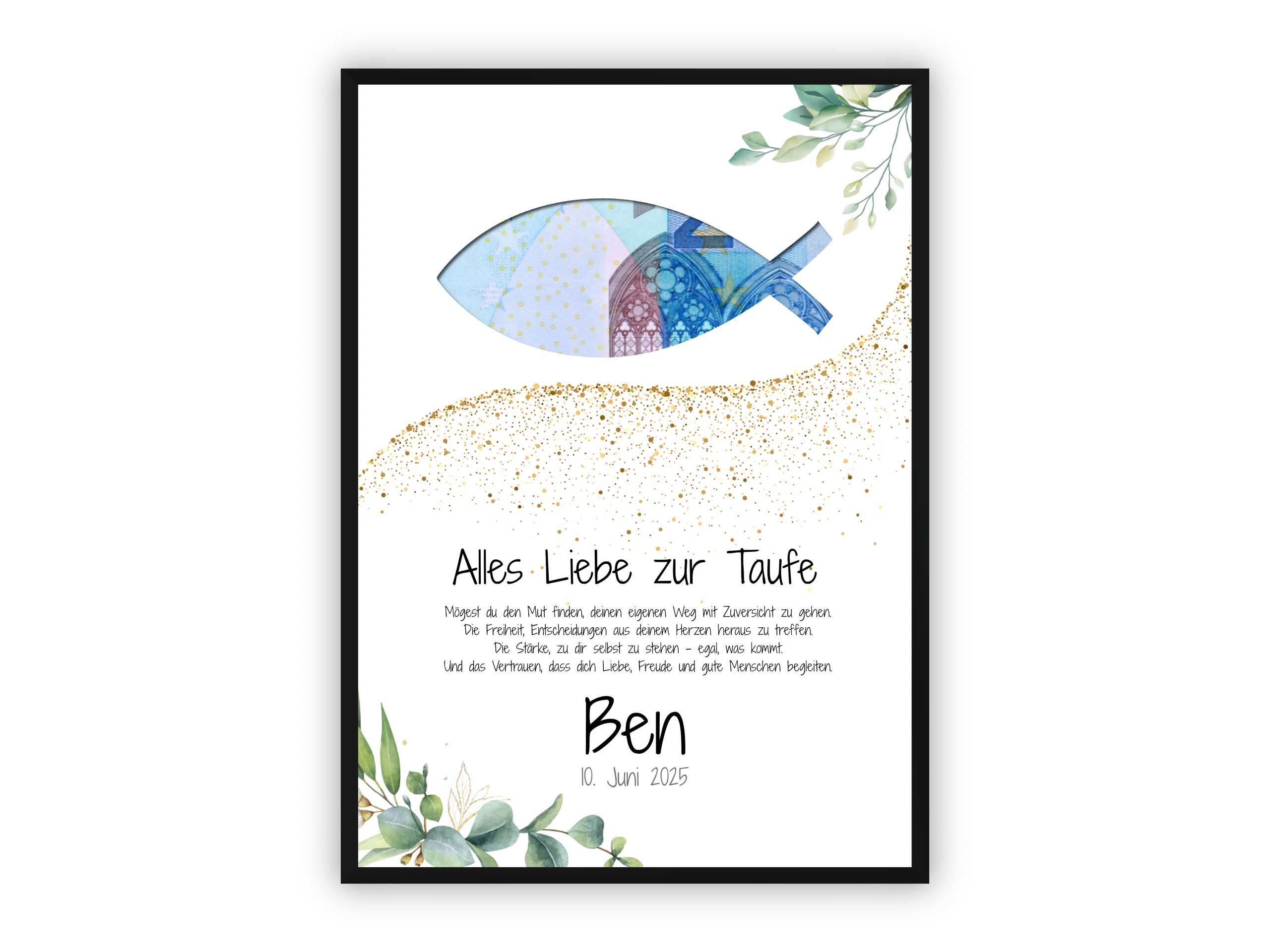 Eine liebevolle Geschenkidee zur Taufe: Das christliche Fischsymbol in Geldschein-Optik, kombiniert mit einem poetischen Segensspruch, zarten Grüntönen und goldenen Akzenten, macht dieses Motiv zu einer modernen und zugleich symbolträchtigen Überraschung zur Feier des Glaubens.